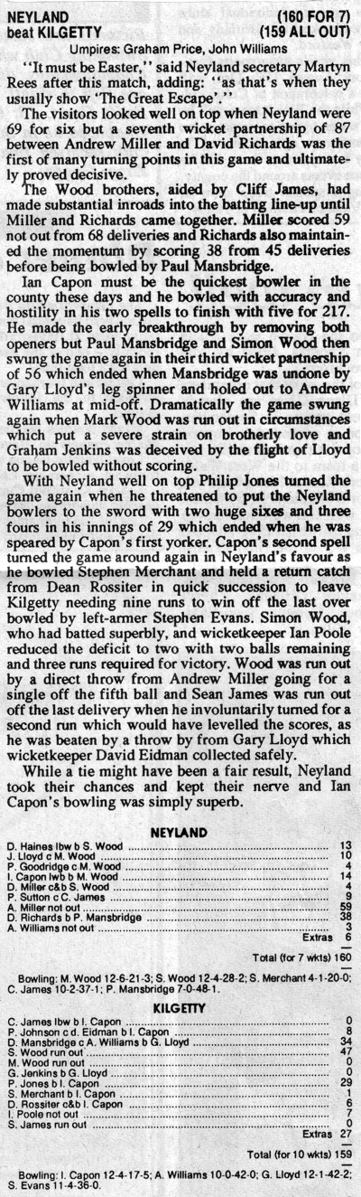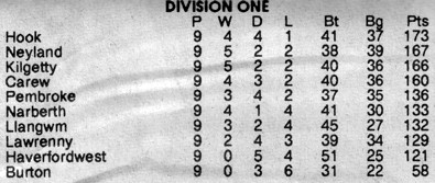Division 1 league table at the half way stage of the 1996 season, following Neyland's narrow victory over Kilgetty: