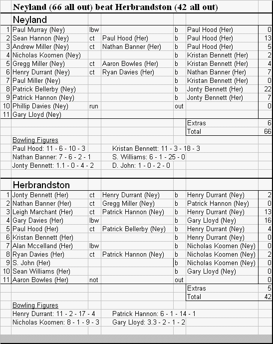 when Hannon was caught and bowled by Hood for a patient 13 runs. And by the end of the following over Neyland's innings was in complete