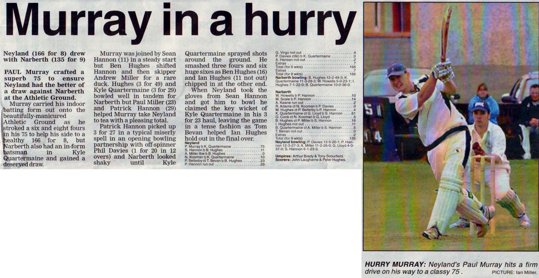Murray took two 2's from Quartermaine's opening over, while Huges stared with a maiden to Hannon. Neyland progressed cautiously until Murray
