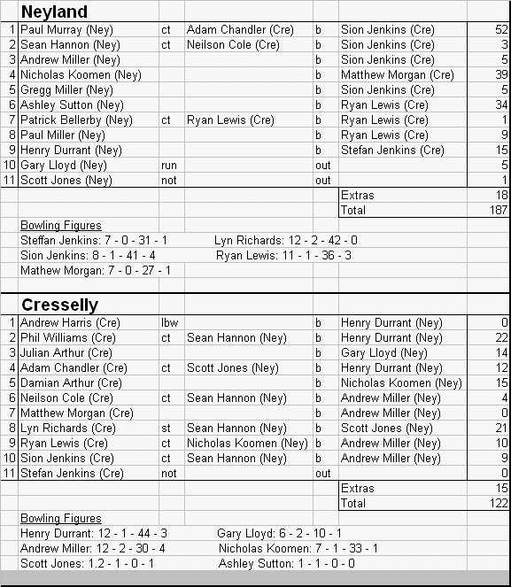 A Cresselly victory looked unlikely, and with 19 overs remaining Neyland now stood a good chance of winning the game as close fielders
