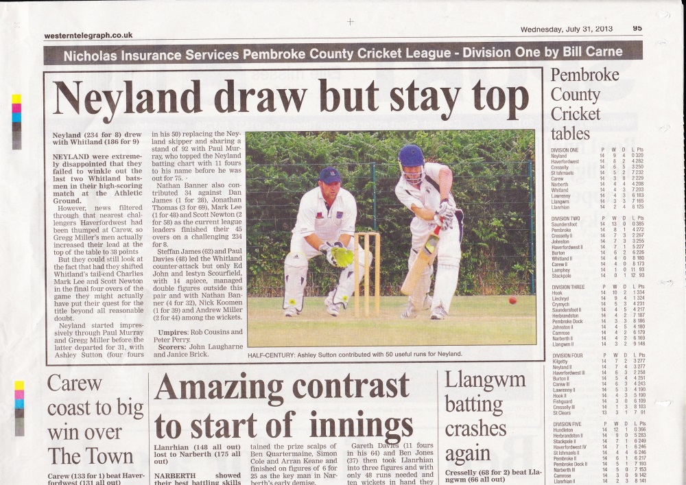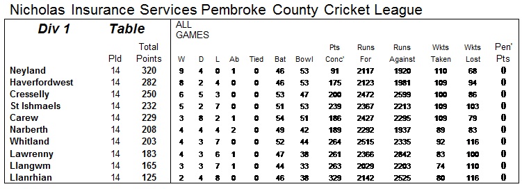 League table following Neyland's winning draw against Whitland: