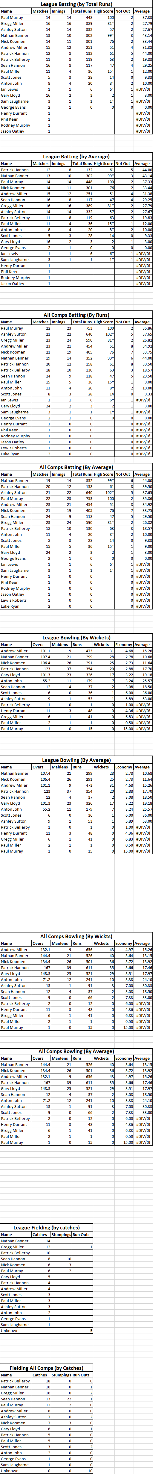 averages for all 1st team matches, broken down into league games, various cup competitions, including catches etc.