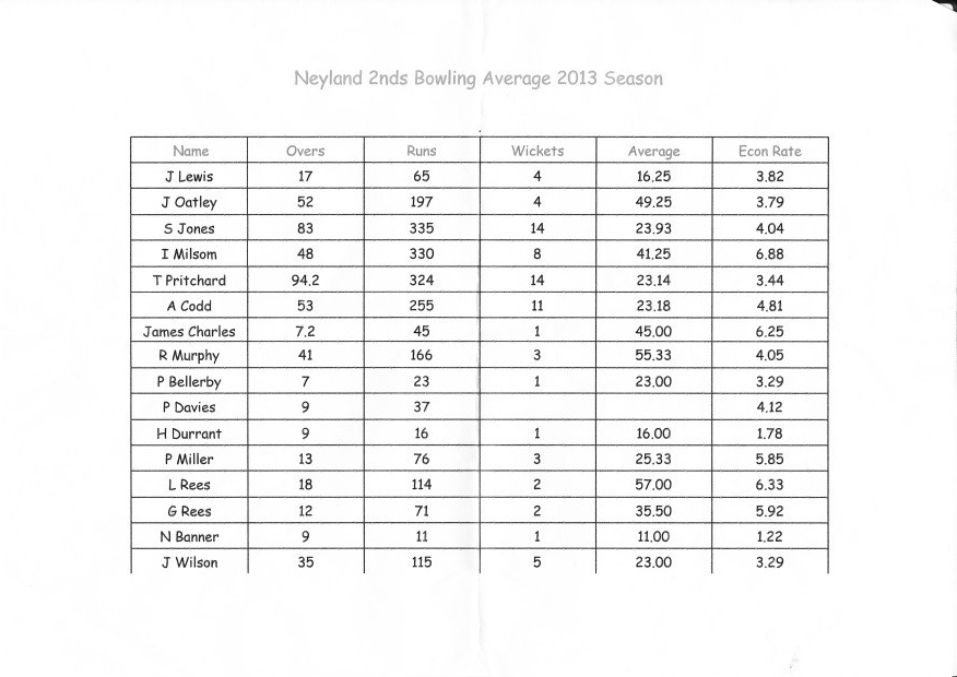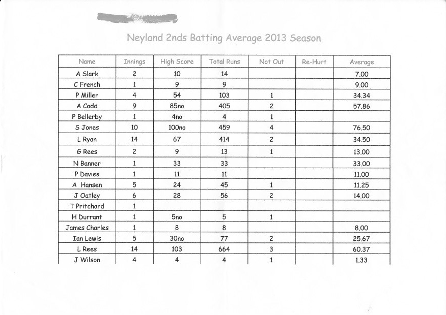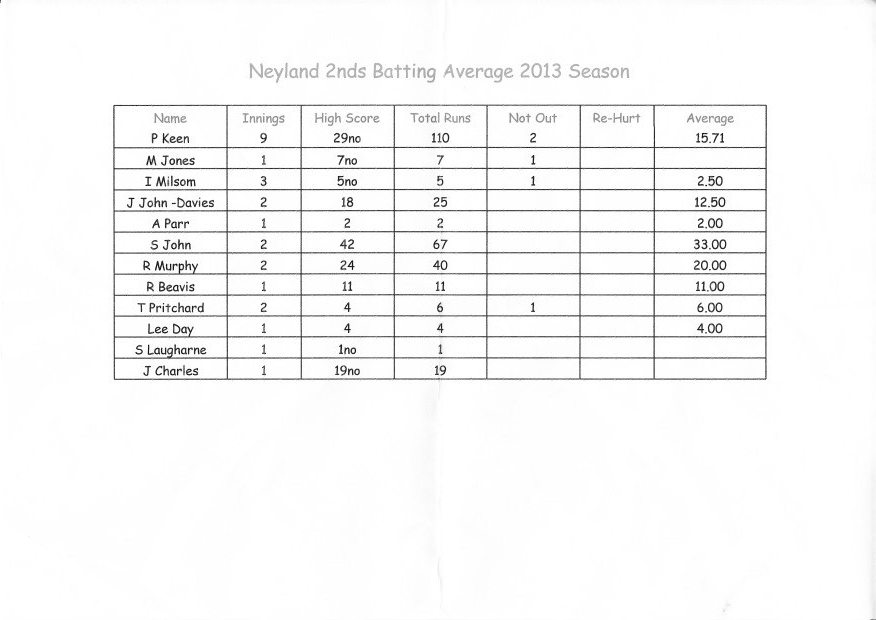 Neyland Cricket Club 2nd XI Averages, 2013.