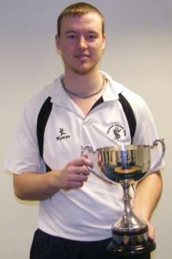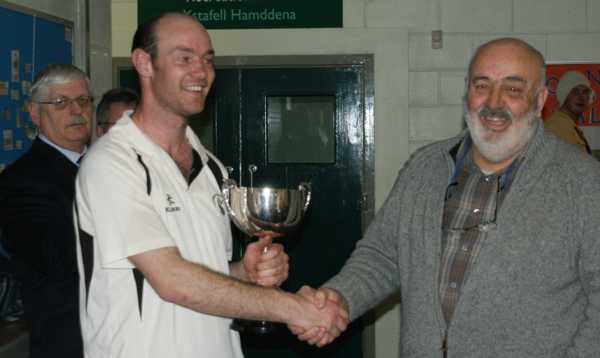 Bill Carne Presents the cup to captain Gregg Miller, with PCCC Chairman Trefor Evans also in attendance.