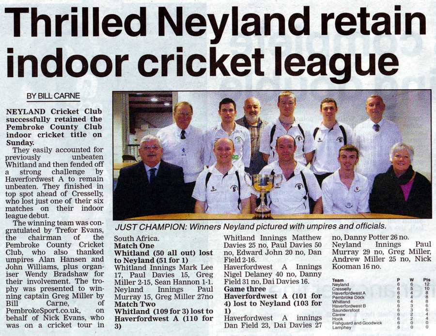 Neyland retain the Indoor League in 2010, defeating both Whitland and Haverfordwest on the final weekend to finish with a