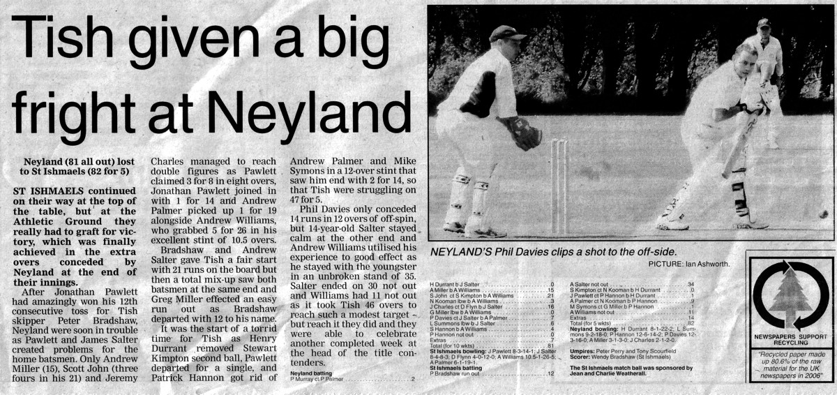 toss from Salter, but none of the remaining Neyland batsmen provided much resistance as Phil Davies, 7, Lee Summons, 6,