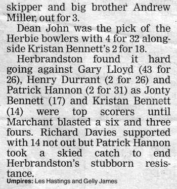 Miller played a number of classy shots alongside Phil Sutton and the score progressed to 50 off 12. The demise of Sutton saw