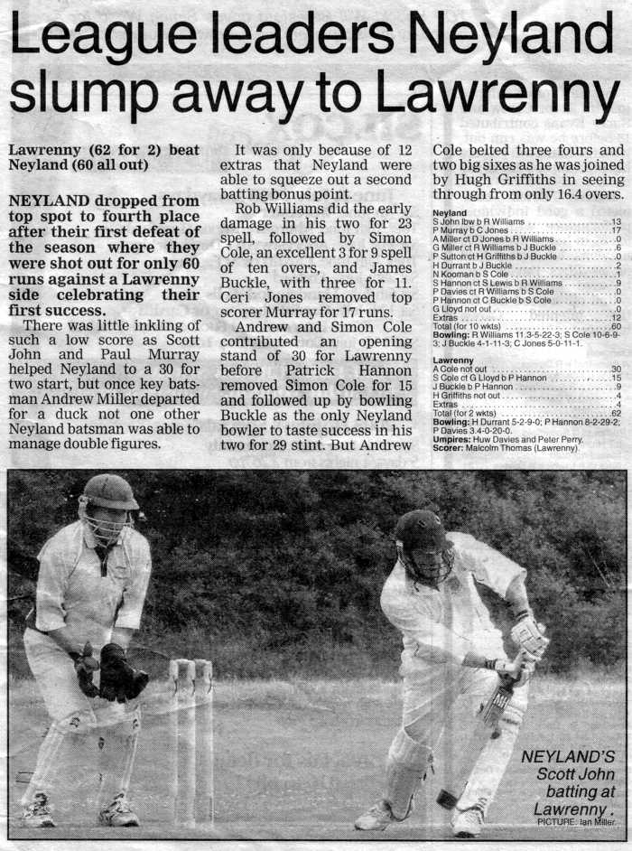 Scott John and Paul Murray opened the batting, while the reliable Rob Williams opened with Simon Cole for Lawrenny. The match