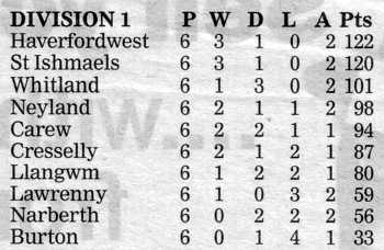 League table following Neyland's loss to Lawrenny:
